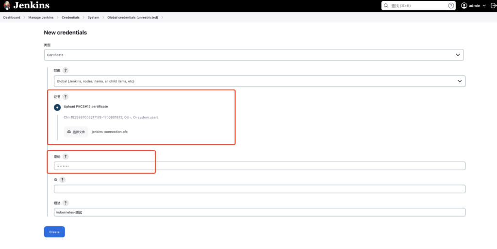 此时我们创建了4个文件:ca.crt、jenkins-connection.pfx、client.crt、client.key,其中ca.crt的文件内容在创建Jenkins连接到kubernetes集群时需要用,jenkins-connection.pfx需要上传到Jenkins的凭据配置中