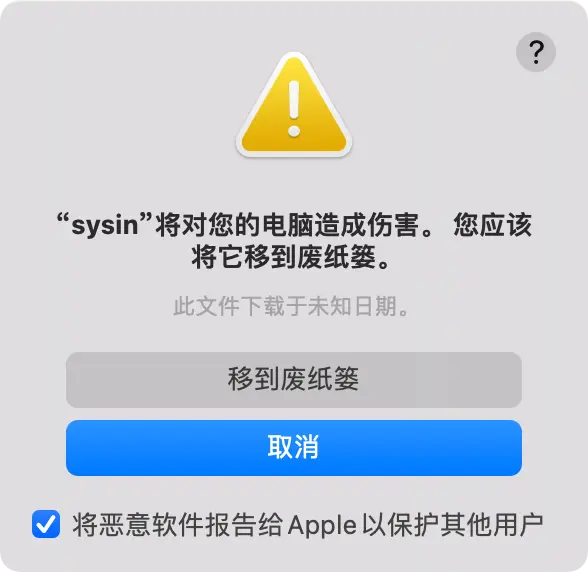 - 提示:“应用程序” 将对您的电脑造成伤害。您应该将它移到废纸篓。