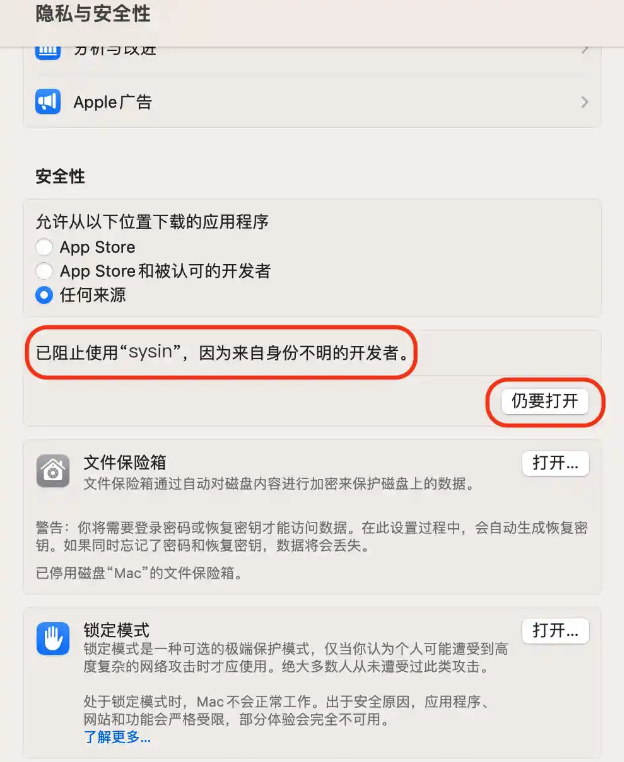 - 系统设置 – 隐私和安全性,“安全性” 下面出现提示,点击 “仍要打开”,当然该操作仅需要一次,以后可以正常打开。
