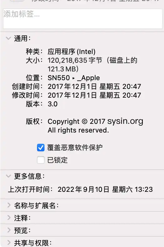 - 解决办法:访达 -> 应用程序 -> 右击软件 -> 显示简介,勾选 “覆盖恶意软件保护”。