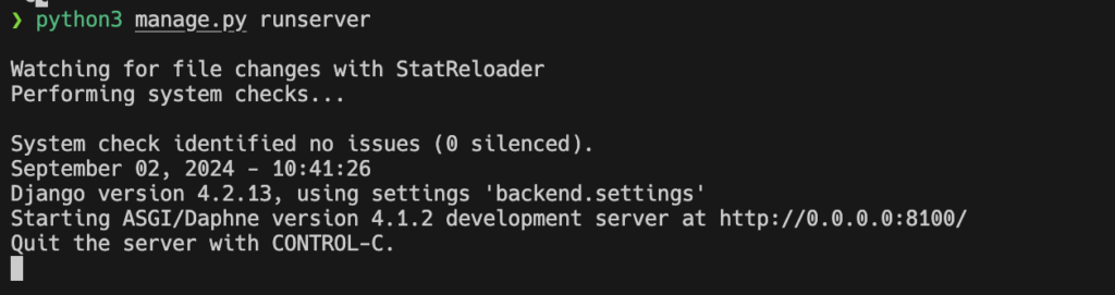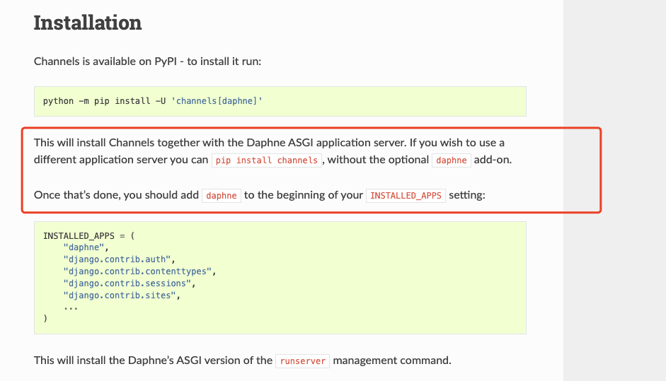 Daphne 提供了一个 runserver 命令,用于在开发过程中使用 ASGI 来提供站点服务。这可以通过将 daphne 添加到你的 INSTALLED_APPS 的开头,并添加一个指向你的 ASGI 应用程序对象的 ASGI_APPLICATION 设置来启用: